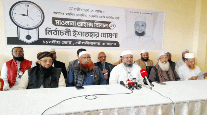 মৌলভীবাজার ৩ (সদর ও রাজনগর) আসনে ১১ দলীয় জোট মনোনীত খেলাফত মজলিসের প্রার্থী প্রিন্সিপাল মাওলানা আহমদ বিলাল তাঁর নির্বাচনী ইশতেহার ঘোষণা করেছেন।