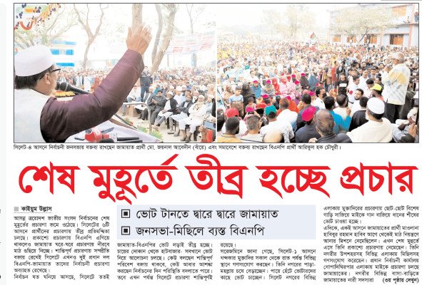 আসন্ন ত্রয়োদশ জাতীয় সংসদ নির্বাচনের শেষ মুহুর্তের প্রচারণা জমে ওঠেছে। সিলেটের ৬টি আসনে প্রার্থীদের প্রচারণায় তীব্র প্রতিদ্বন্দ্বিতা চলছে। প্রকাশ্যে প্রচারণায় বিএনপি এগিয়ে; জামায়াত ঘরে-ঘরে প্রচারণায় নীরবে মাঠ গোচাচ্ছে। শান্তিপূর্ণ প্রচারণায় সম্প্রীতি বজায় রেখেই সিলেটে এখনও দুই প্রধান দল বিএনপি-জামায়াত তাদের নির্বাচনী প্রচারণা অব্যাহত রেখেছে। নির্বাচন যত ঘনিয়ে আসছে, সিলেটে ততই ভোটারদের দখলে জামায়াত-বিএনপির লড়াই তীব্র হচ্ছে।
